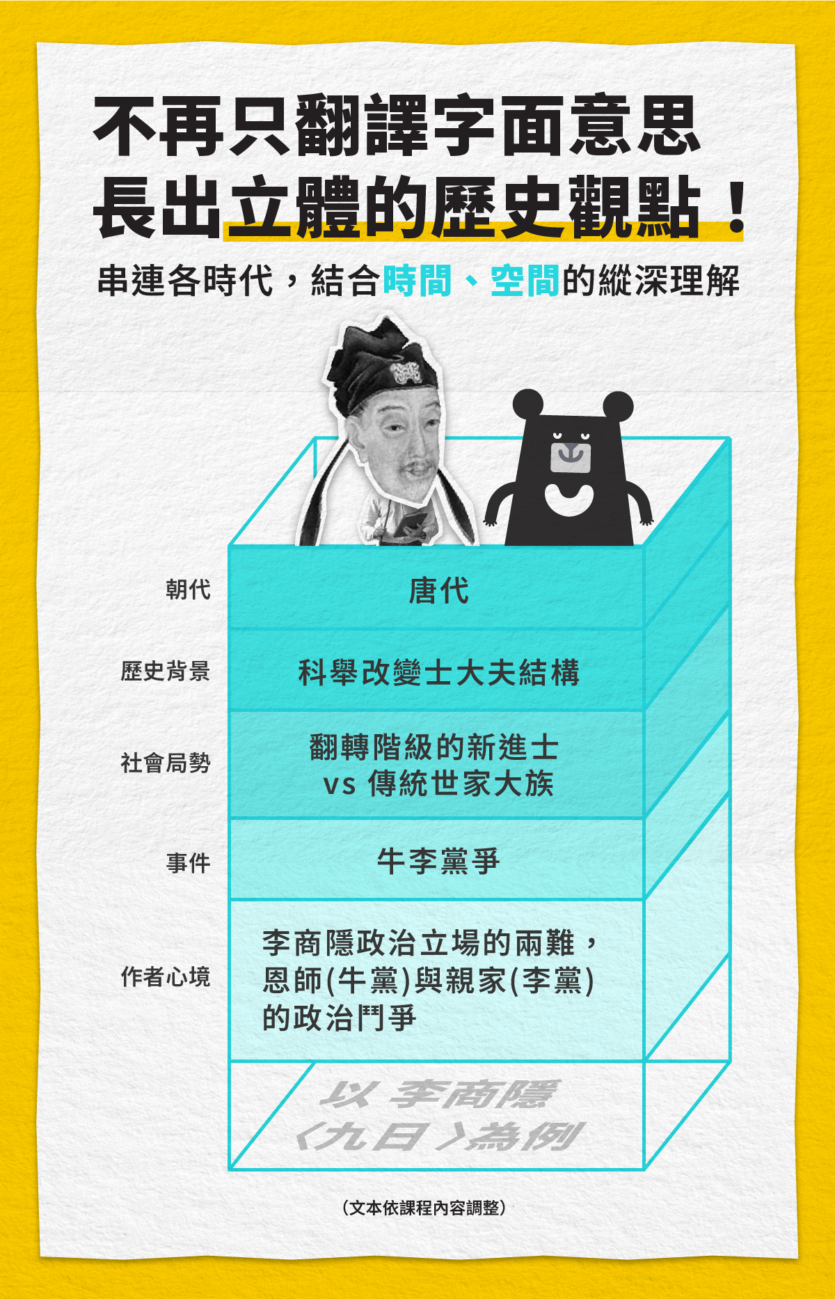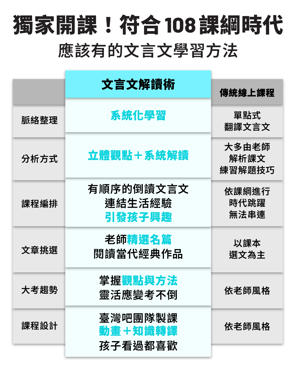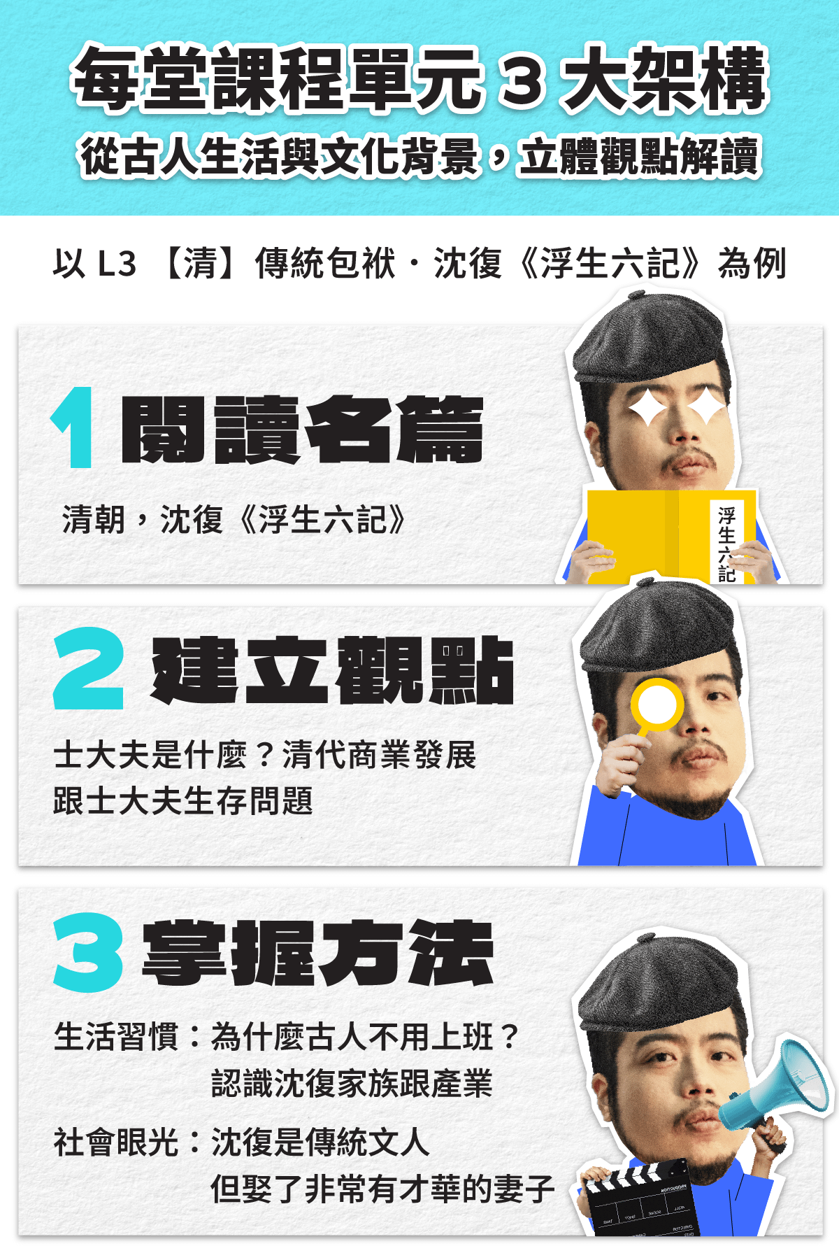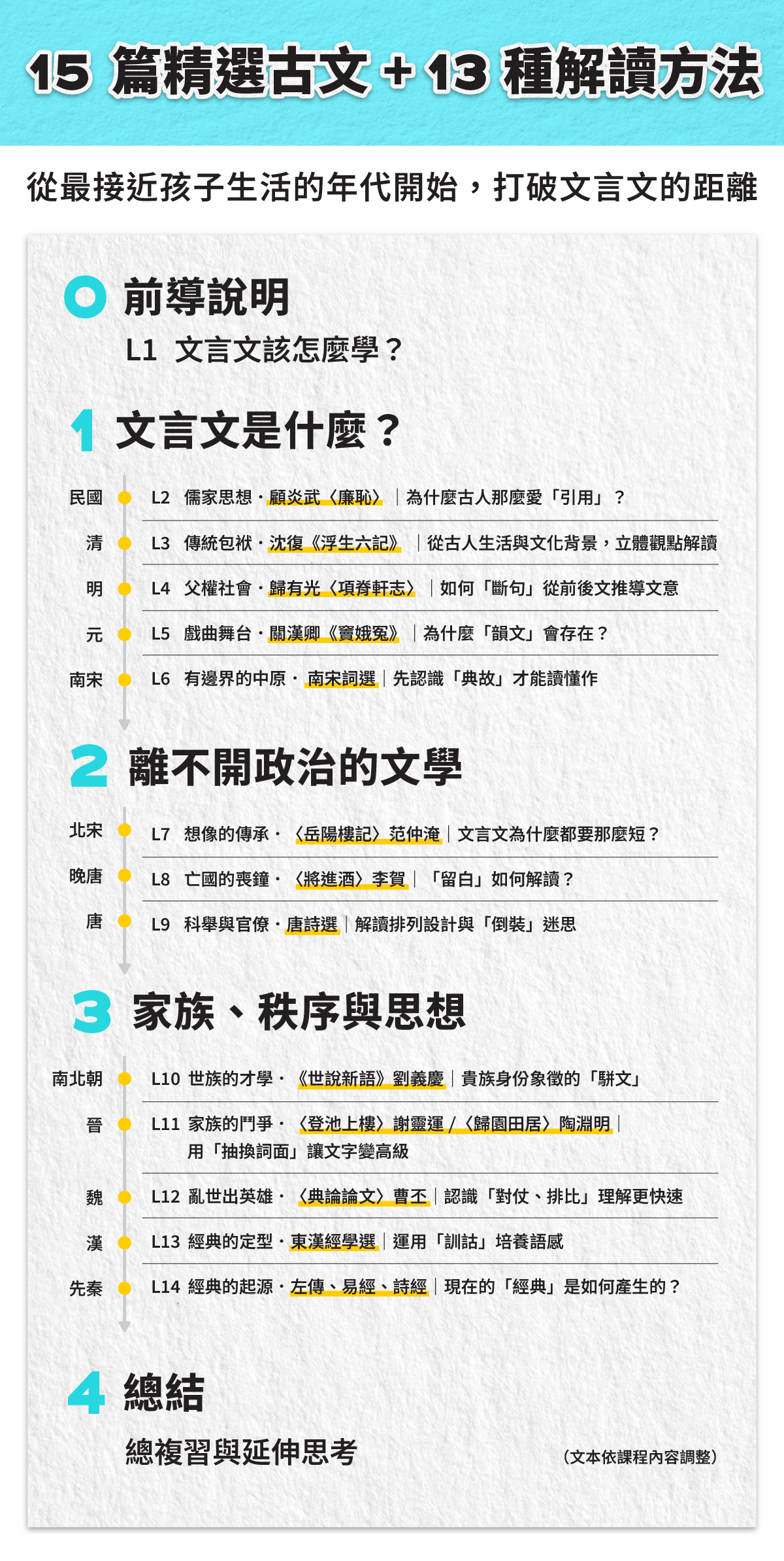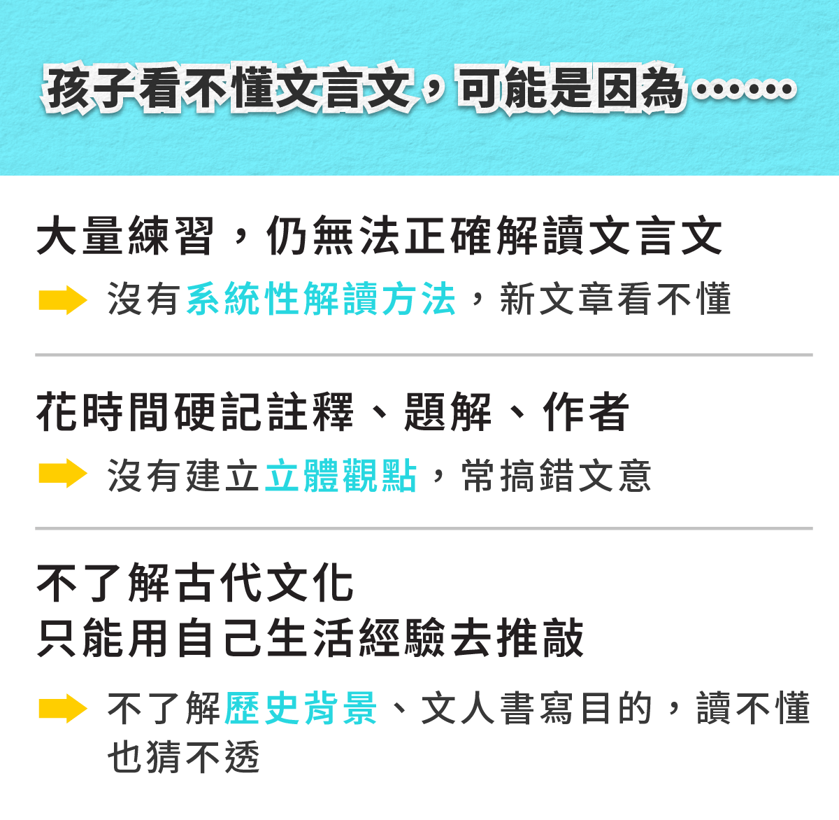 我知道線上課的篇幅,不可能完全解決孩子閱讀文言文時的問題,但建立立體而相對完整的觀念,卻能夠讓理解古文時的門檻降低,能有效消除心裡的排斥與焦慮。
