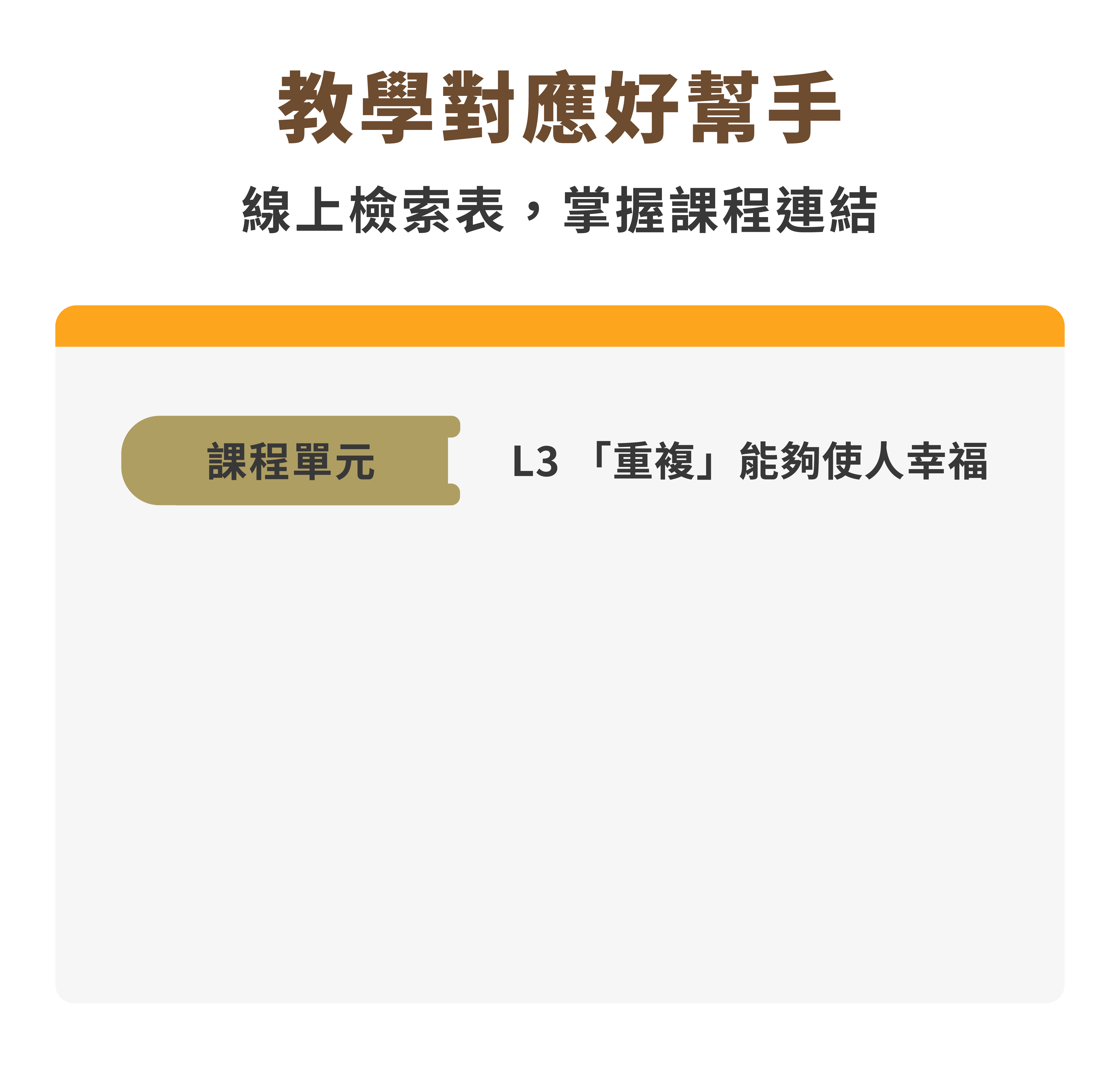 課程單元清楚對應,一眼看出單元重點與建議搭配選文,快速整合教學內容,節省課程設計時間!
