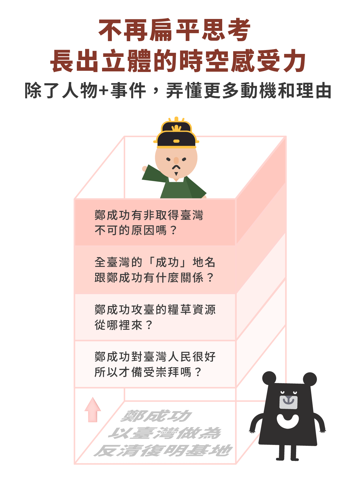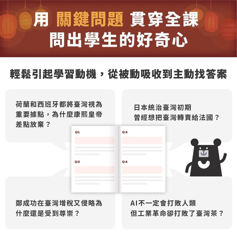 我決定再次賦予《動畫臺灣史》新任務,除了原有的動畫之外,搭配課綱臺灣史的完整架構,以及我自己來設計問題、帶孩子一起思考,除了學好歷史、考好社會科,更讓孩子可以複製這些能力,帶往其他領域繼續發揮!