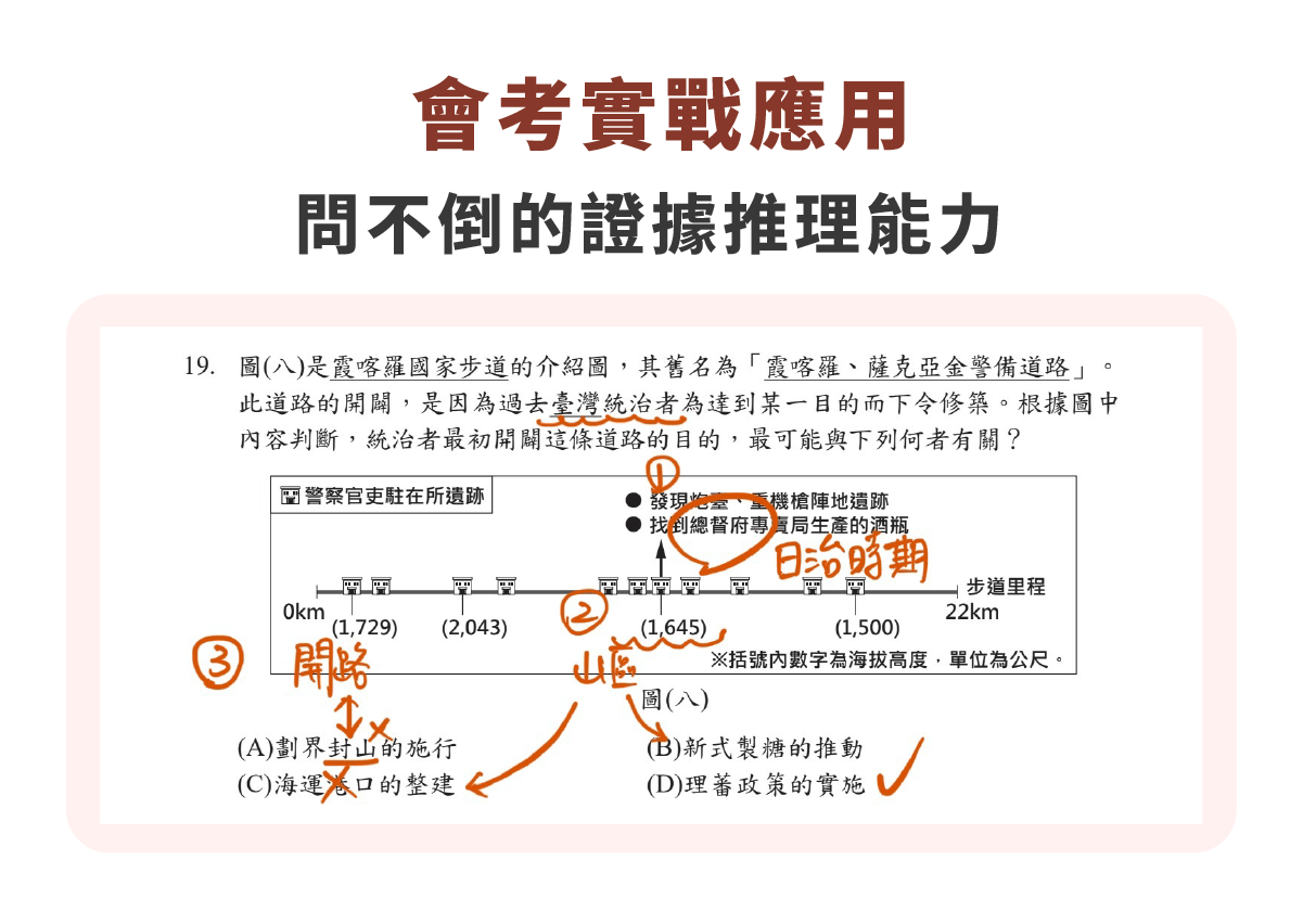 當大考更在意思考和推理能力,平常就更要練習找線索。例如:從看到「海拔高度」聯想到山區、發現「開路」跟「封山」選項相衝突,自然就能推敲出正確答案。