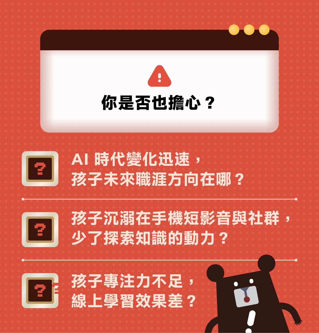 經過調查,我們提出與孩子生活有關的 3 大問題: