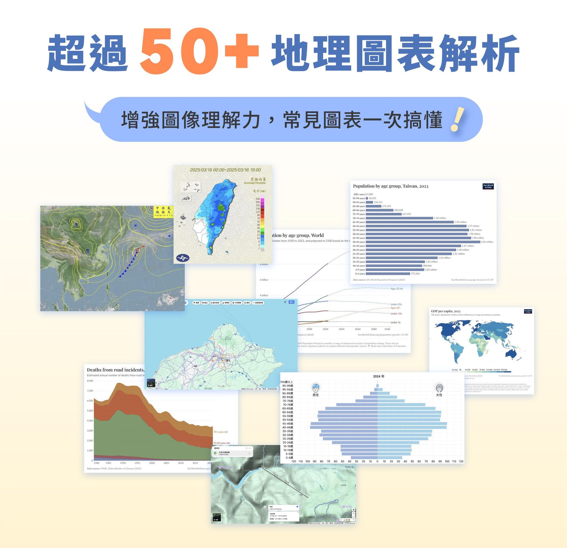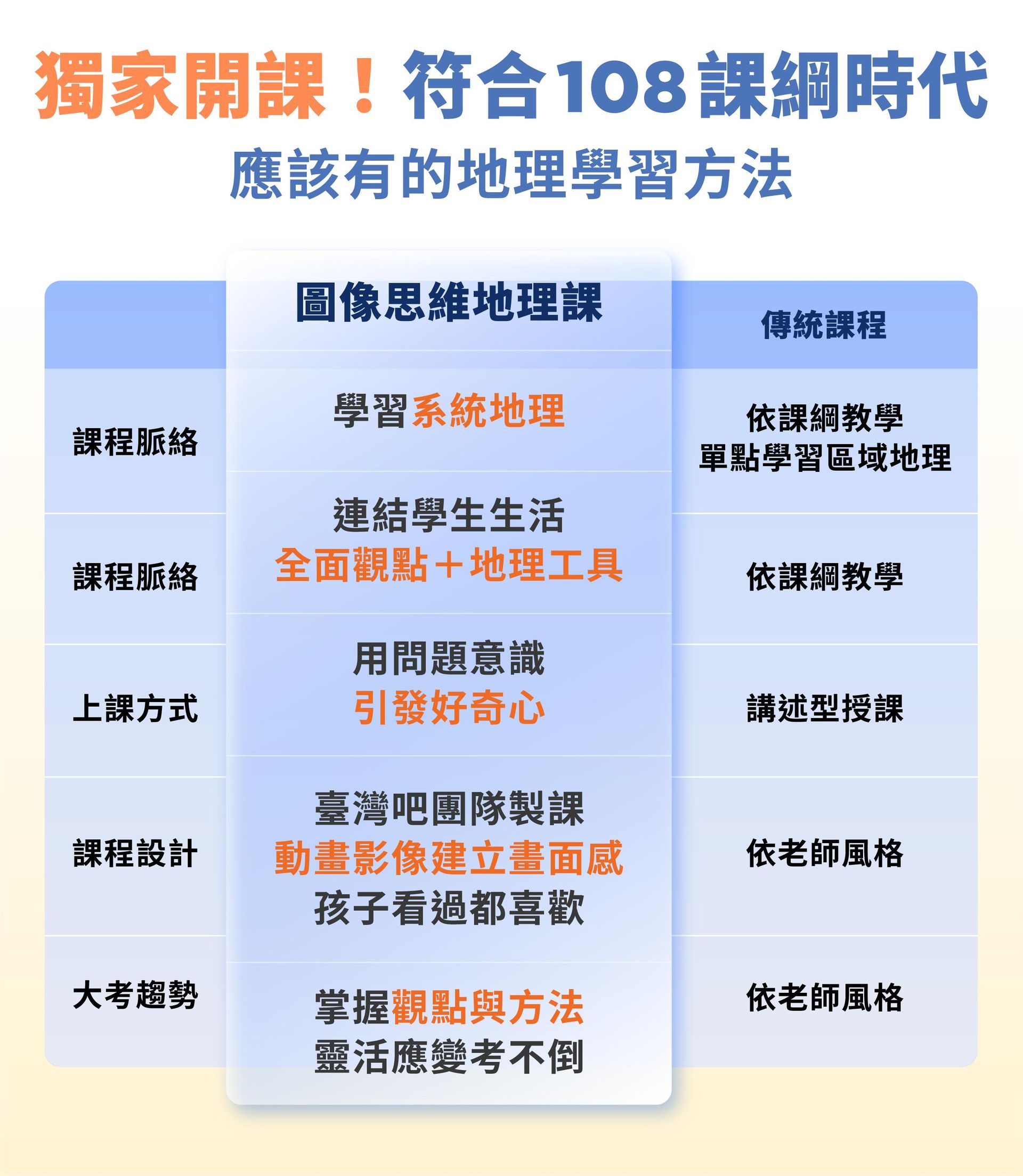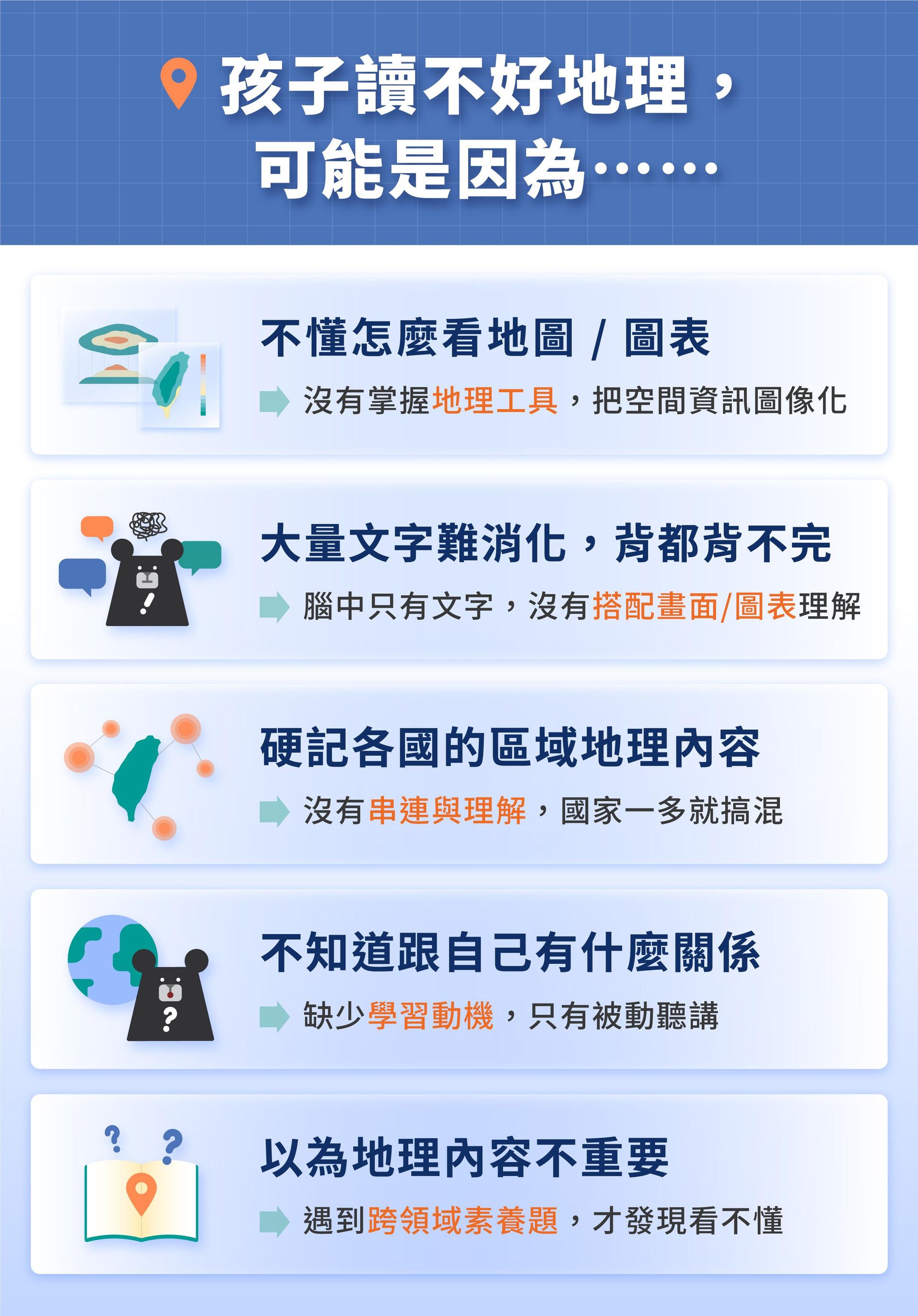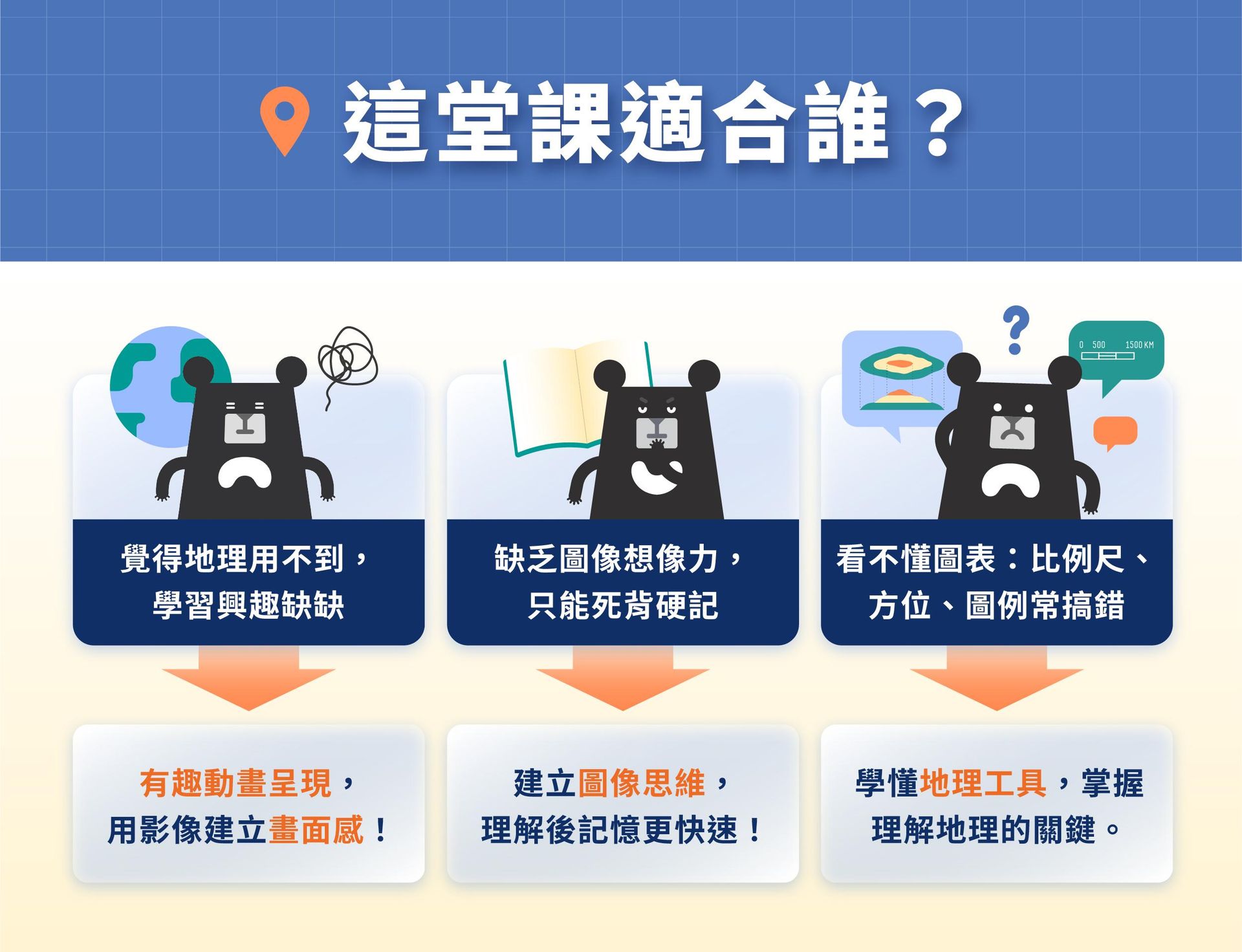 不懂怎麼看地圖、圖表?缺少學習動機,只有被動聽講?這堂課將帶學生掌握地理工具,運用線上課程搭配地理畫面,建立圖像思維,讓學習更有趣,理解更直覺,記憶更輕鬆!