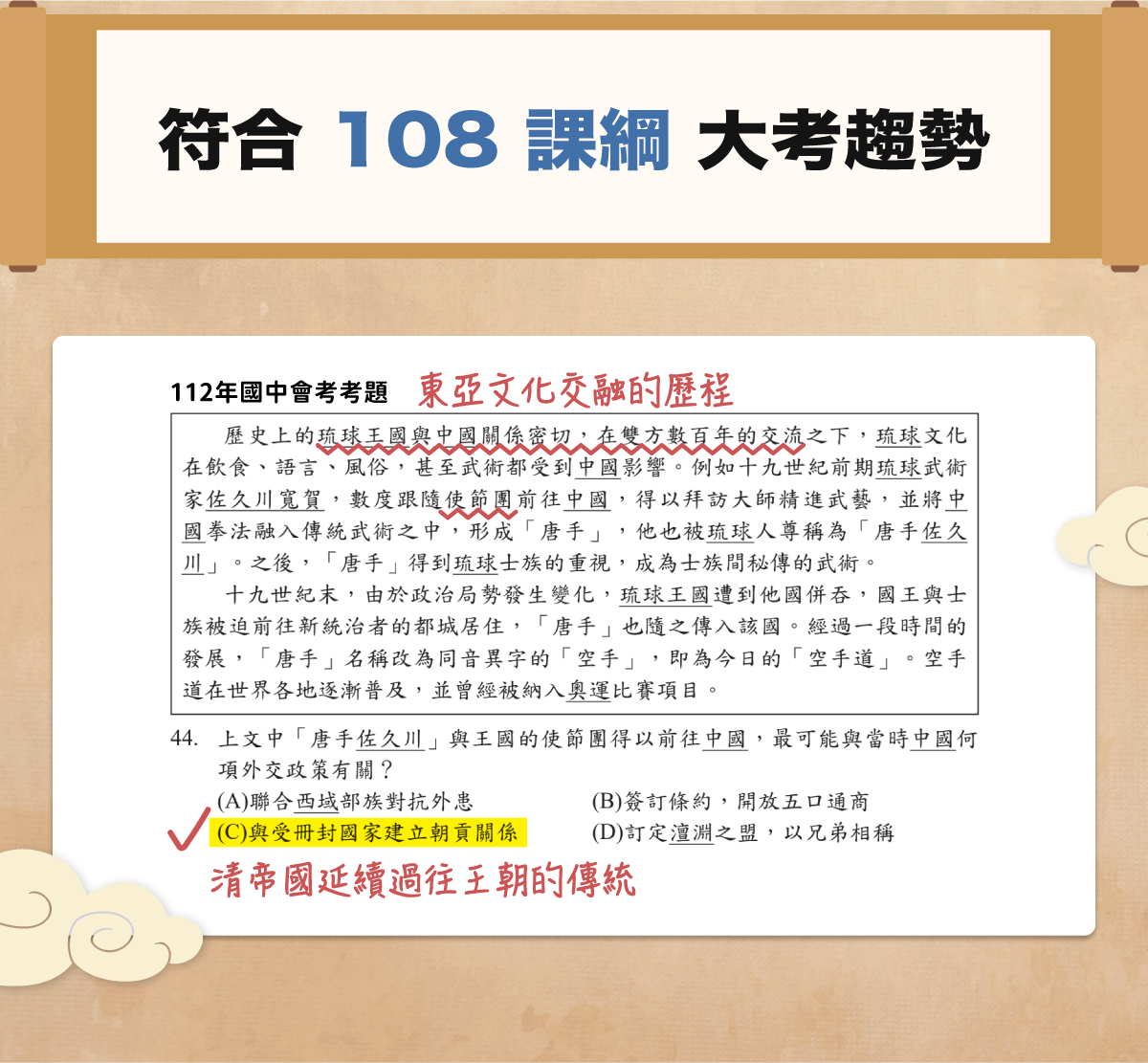 而是希望考生理解「東亞文化交融的歷程」要找出答案不能靠硬記關鍵字,而是要有夠廣闊的區域互動思維!