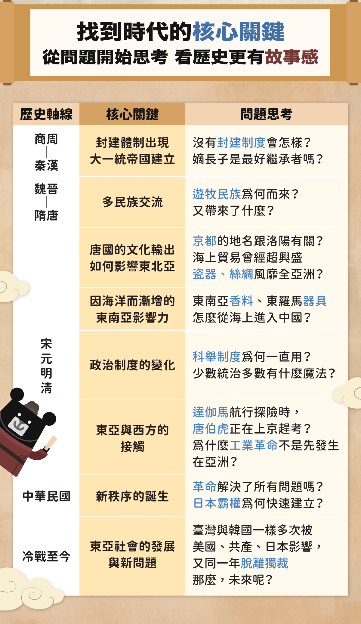 - 建立「商周時代」到「冷戰」的時序脈絡