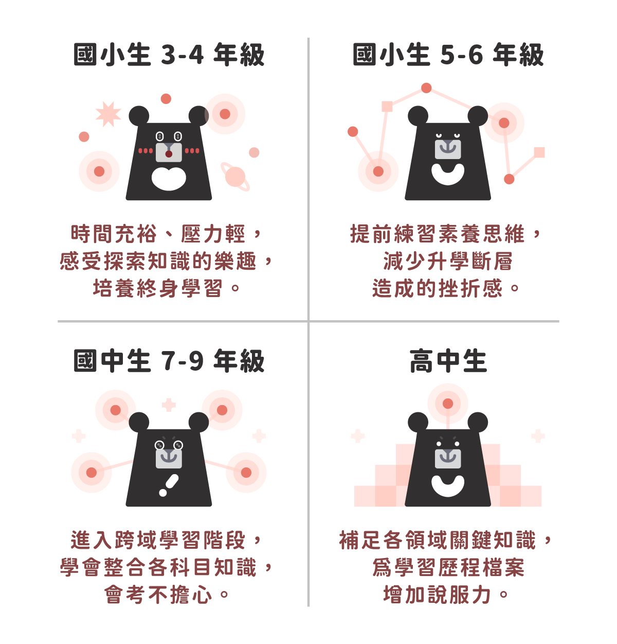 升 5-8 年級打好基礎、升 9 年級剛好會考複習、高中學測前還能再複習,讓基礎更紮實!