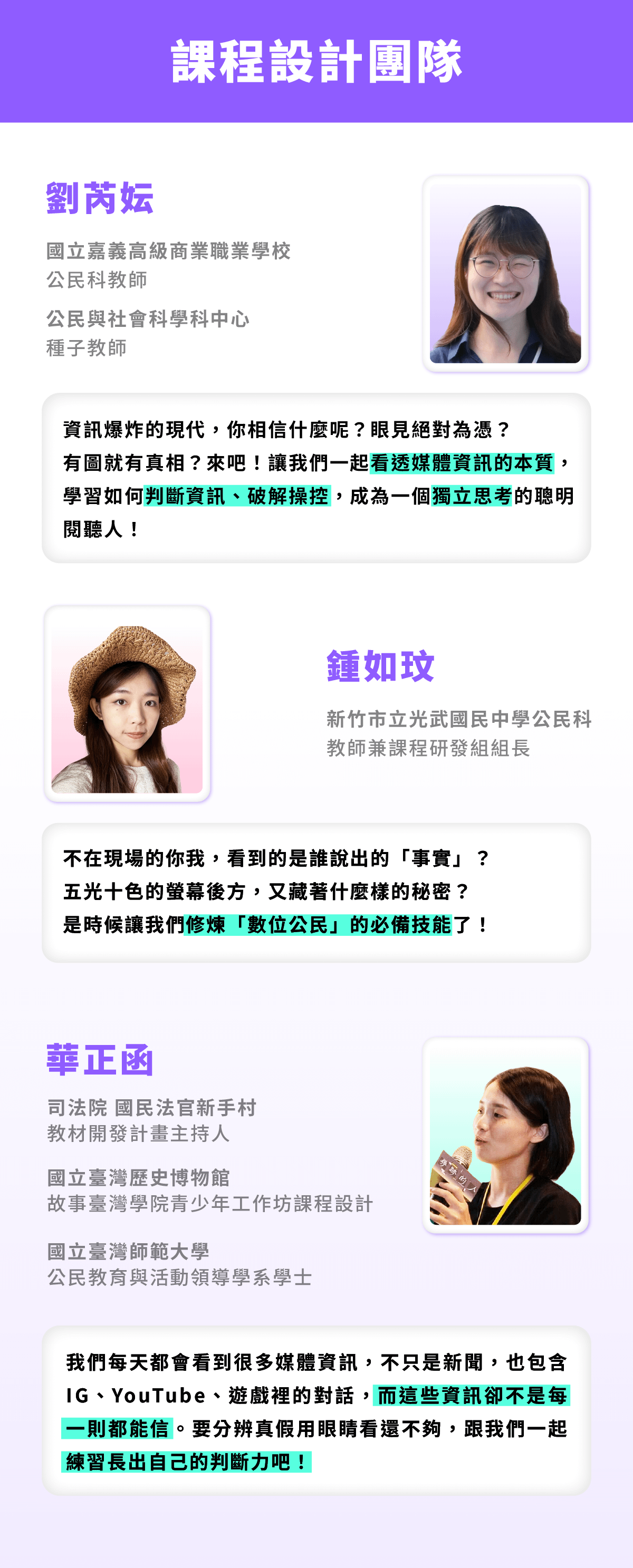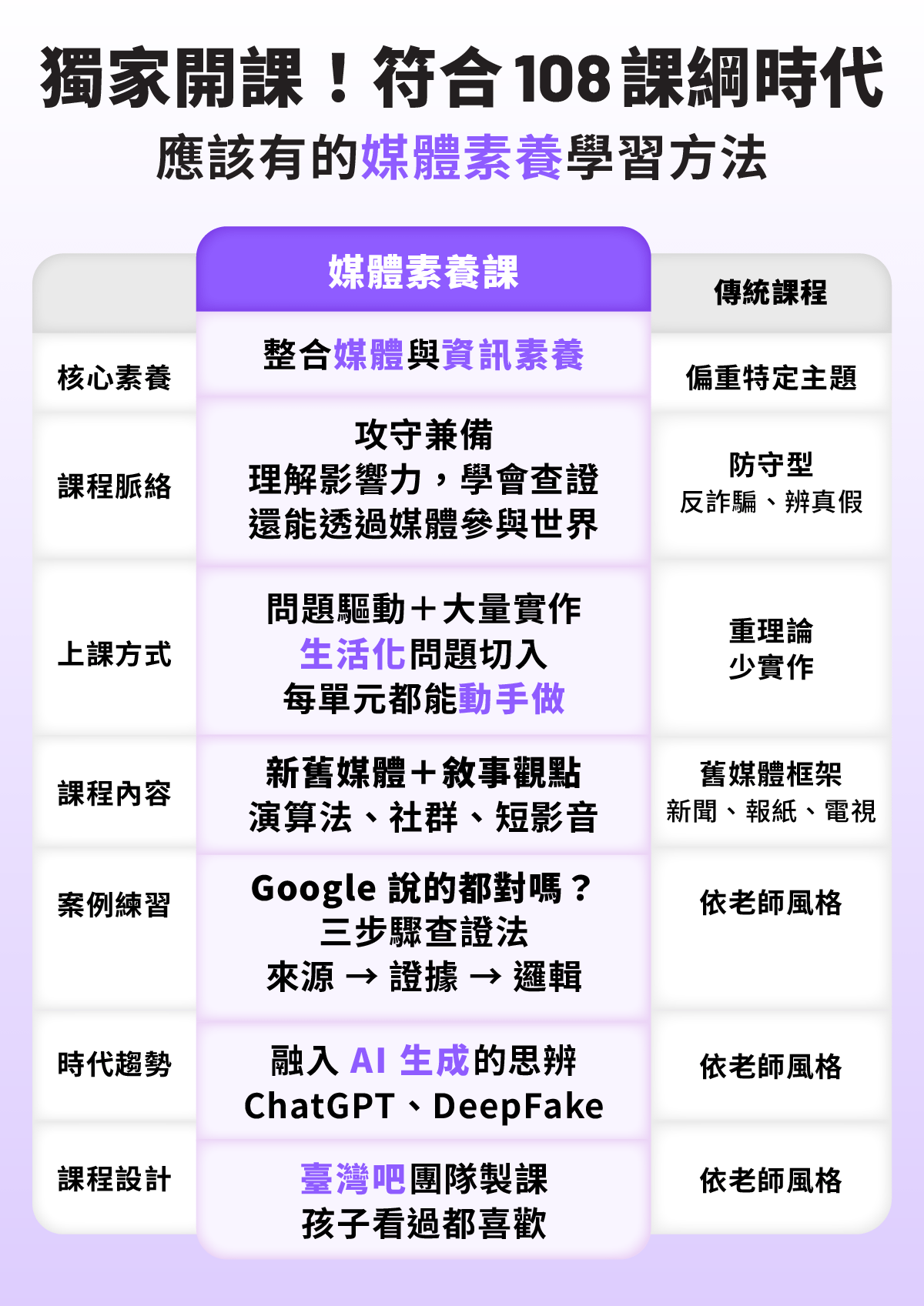 覺得資訊真假難辨、滑社群越滑越焦慮?這堂課將讓孩子告別數位困境!我們將帶學生理解媒體、AI與演算法如何影響生活 ,學習辨識假訊息、主動查證,並培養負責任的表達與參與能力。透過大量實作,讓孩子攻守兼備,成為數位時代的聰明使用者!