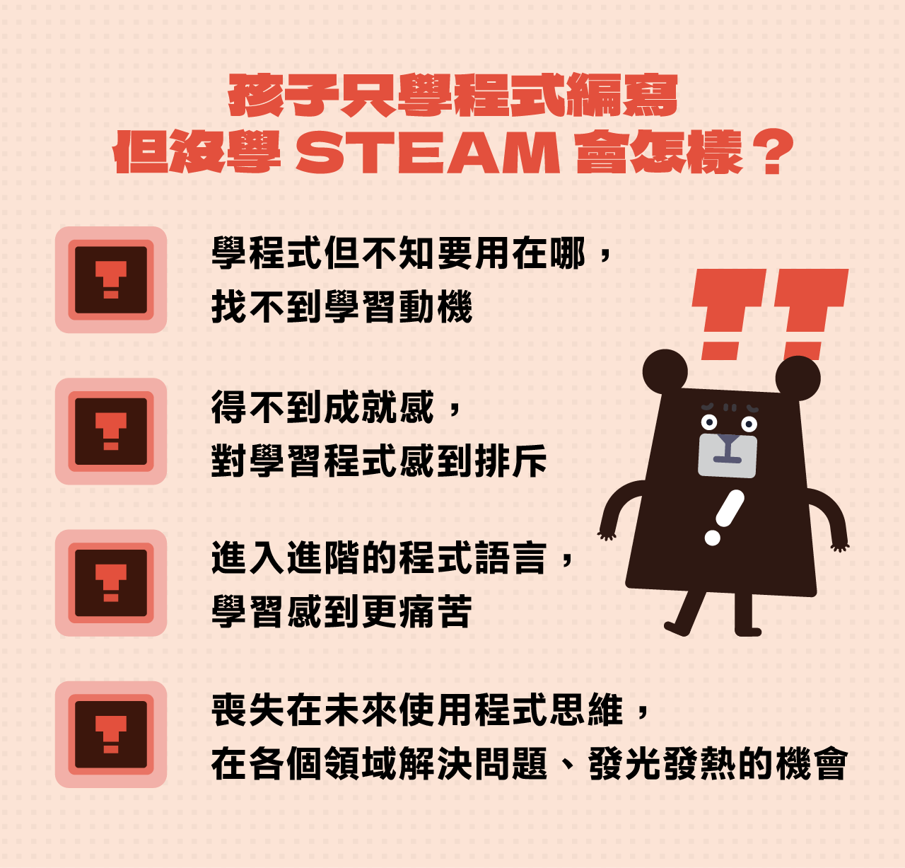 STEAM 教育不只是玩玩積木、寫寫程式。STEAM 教育是讓孩子透過背景知識,去解決日常生活問題的跨領域問題解決課程。