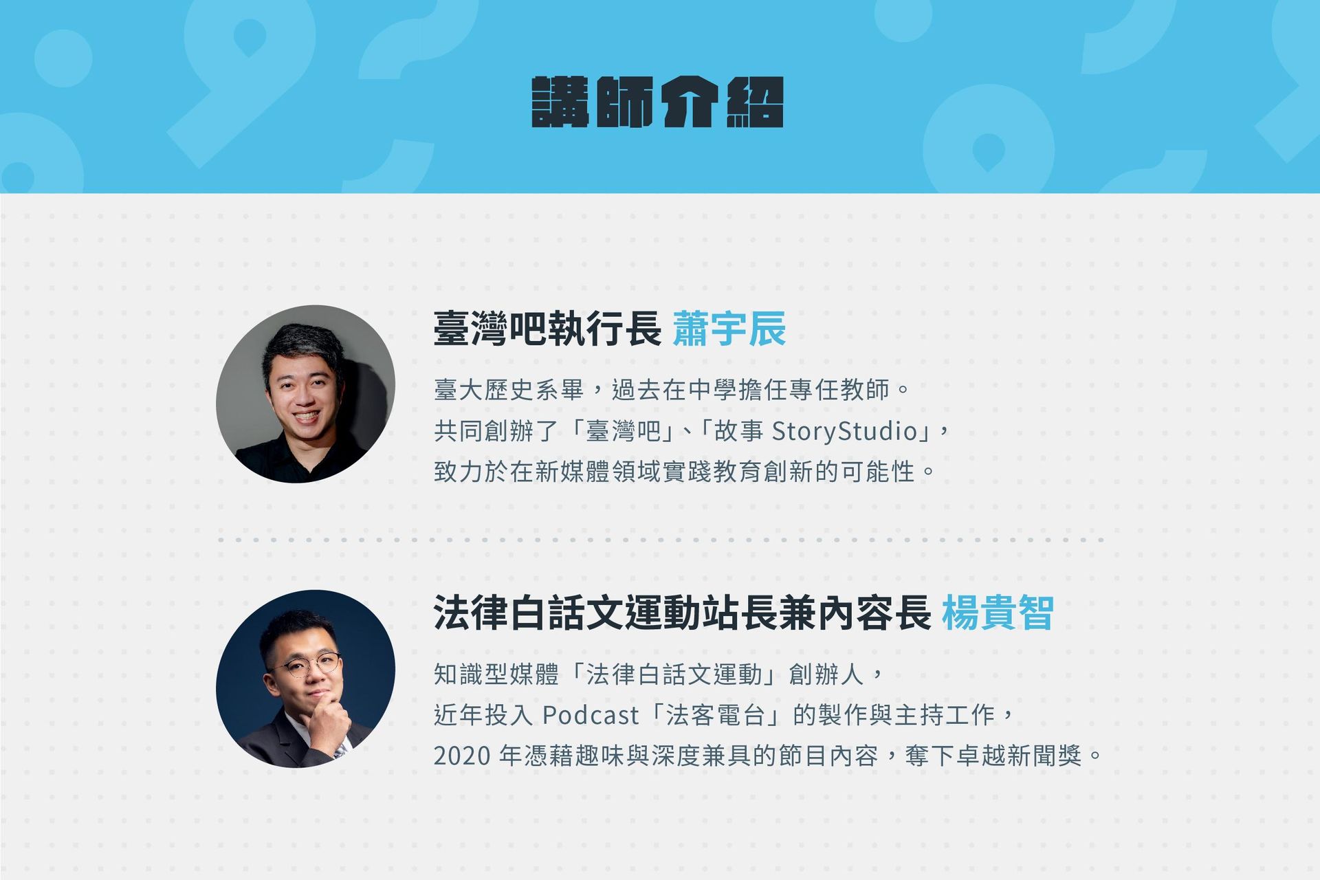 2 對談將在「大抓周學院」平台進行,在活動開始前三天將會收到主辦單位通知信件,活動開始前一小時將會收到系統發放之提醒信件。