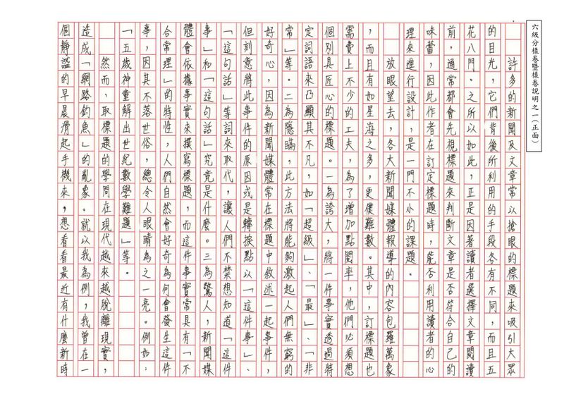 - 閱卷評語:「能依據寫作任務適切選材,從媒體訂定標題的 3 大共同性:誇大、隱瞞、驚人切入,接著以聳動的標題報導正常的氣候現象變化為例,敘寫當代媒體『網路釣魚』的亂象,並提出批判。」